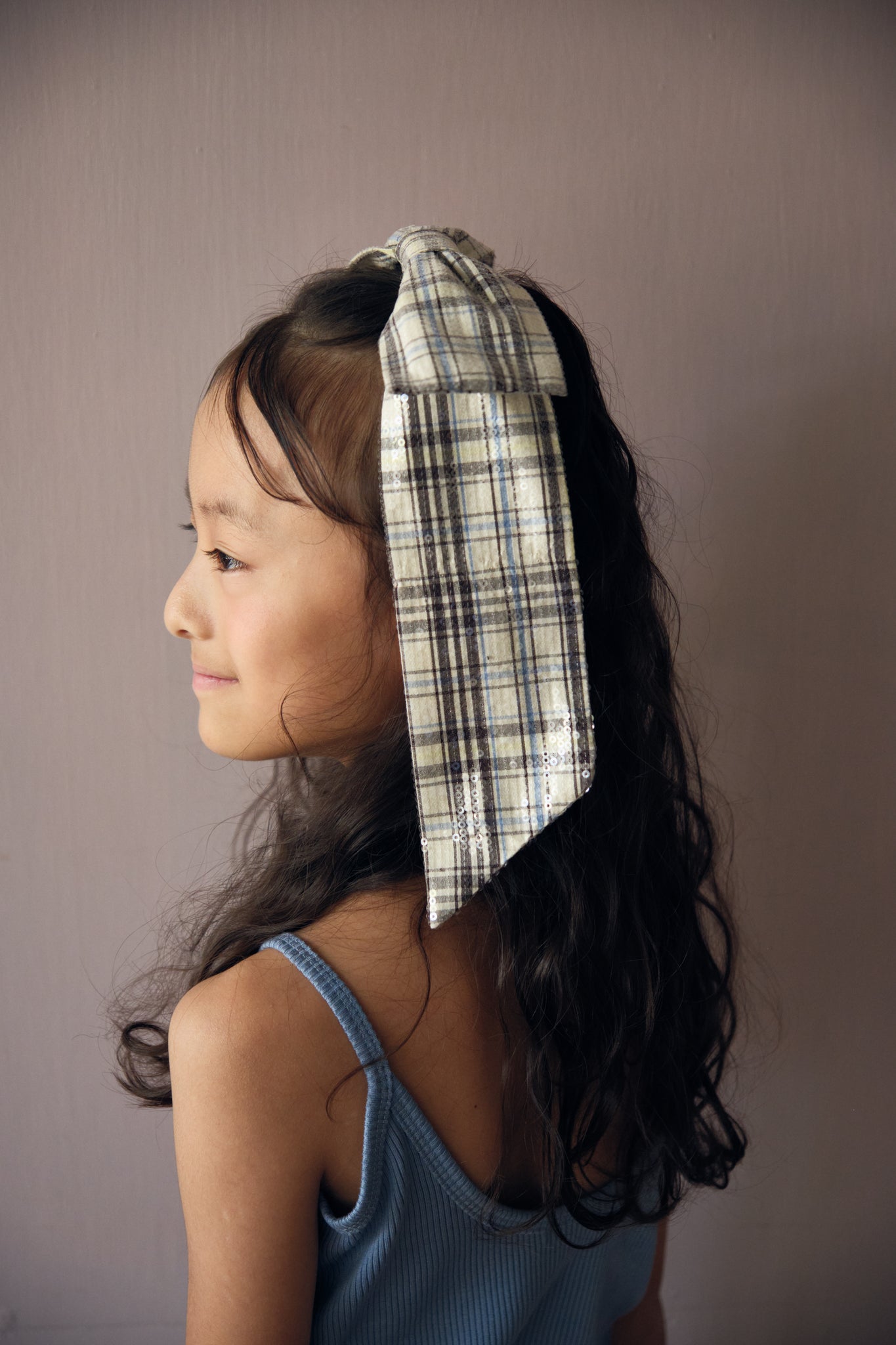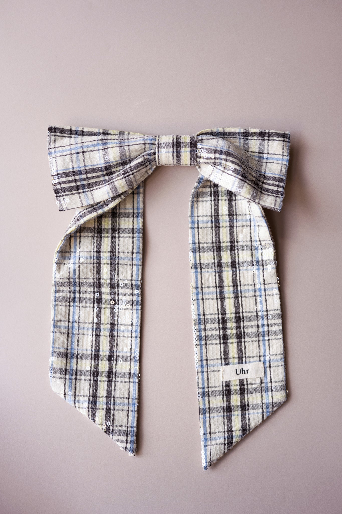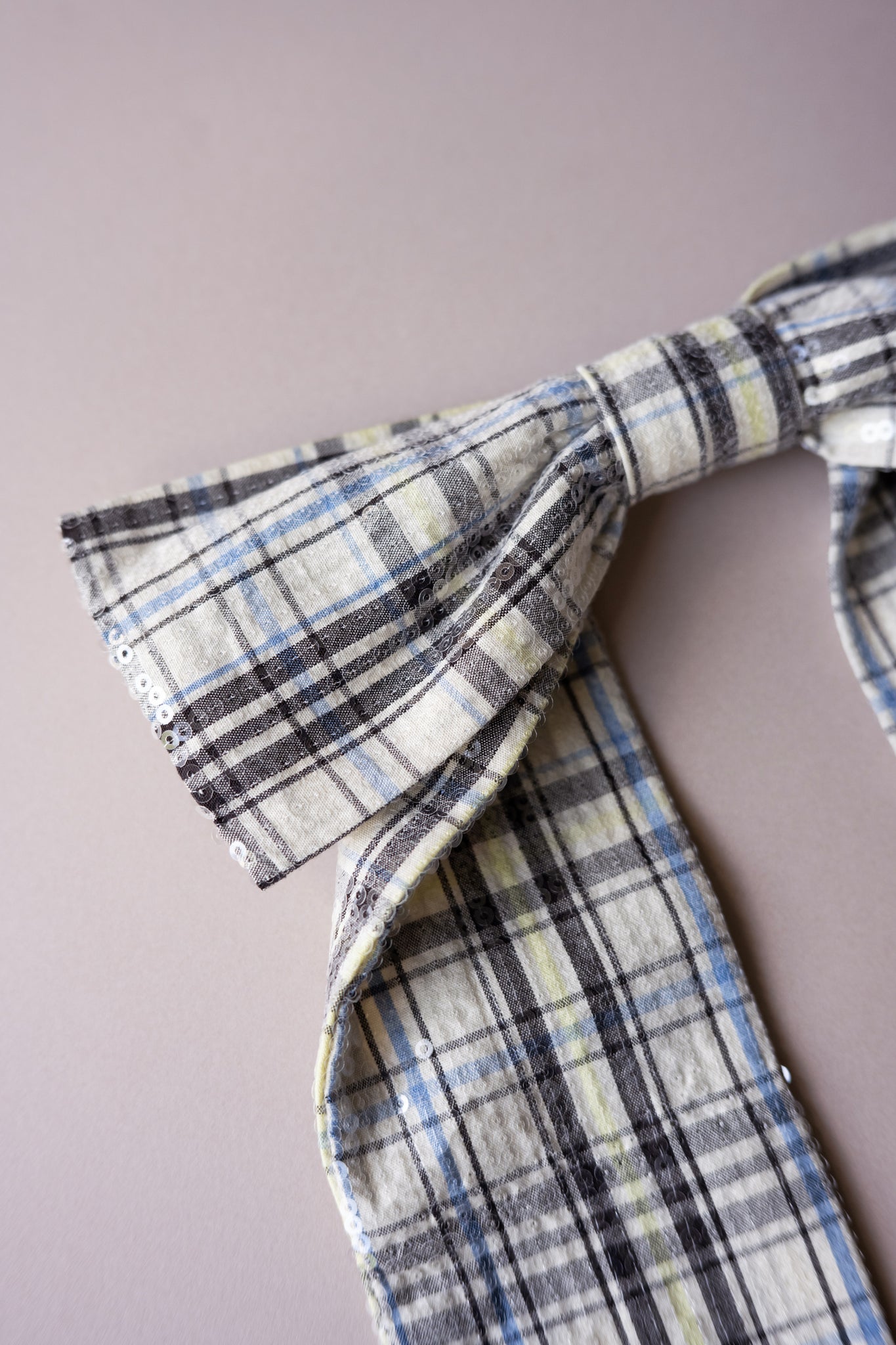 クリーンな印象のチェック柄にクリアスパンコールが施されたヘアピン。大きなリボンがスタイリングのポイントになります。長い髪にも短い髪にもおすすめのビッグリボンのヘアピンです。挟んでつけるタイプなので、簡単に装着できます。 SizeH28cm×W19cmFabricPolyester 100%