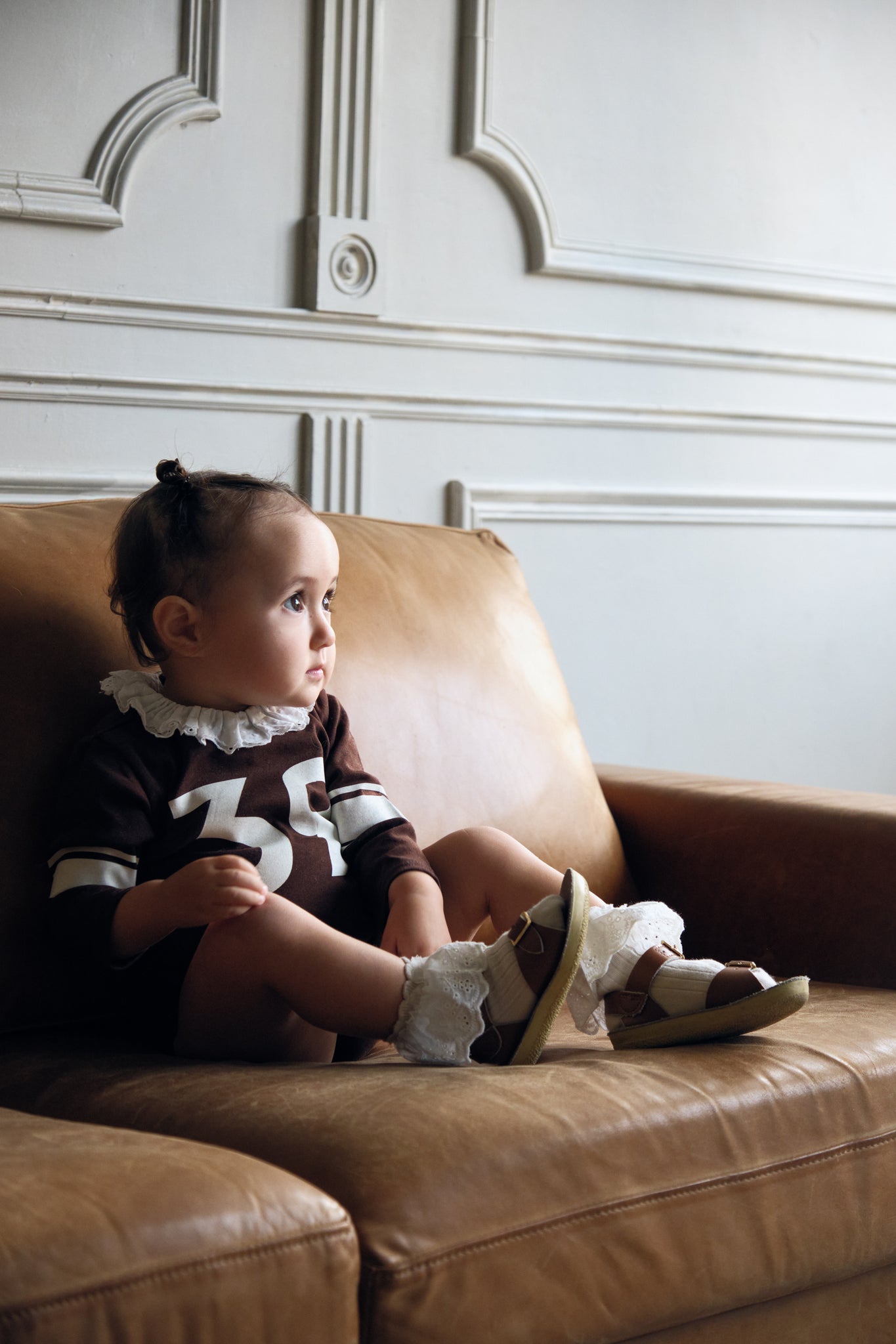 ペットボトル由来の原料から作られたポリエステルと、裁断くずなどを細かく綿状に反毛(はんもう)したコットンを混紡して作られた素材を使用。脱炭素に積極的に取り組む生地工場で作られています。 そんな原料も生産工程もエコな素材を使ったロンパースには「39」のプリントが。 生まれてきてくれてThank you!!という世界からのメッセージです。 襟元のレースは祝福するお花をイメージし、生まれてきてくれたベビーたちを歓迎しています。 0〜1歳向けです。